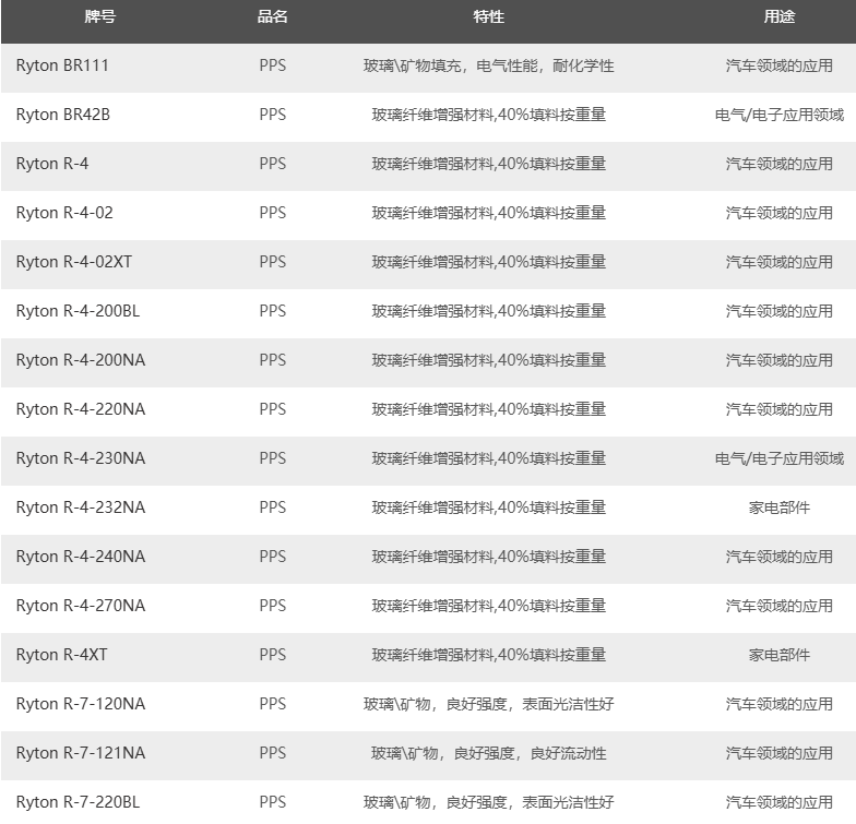 索尔维Ryton PPS材料产品牌有如下列表供选用: