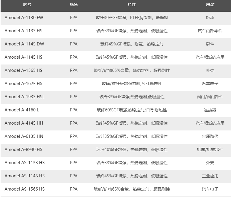 索尔维Amodel PPA材料的主要供应牌号如下: