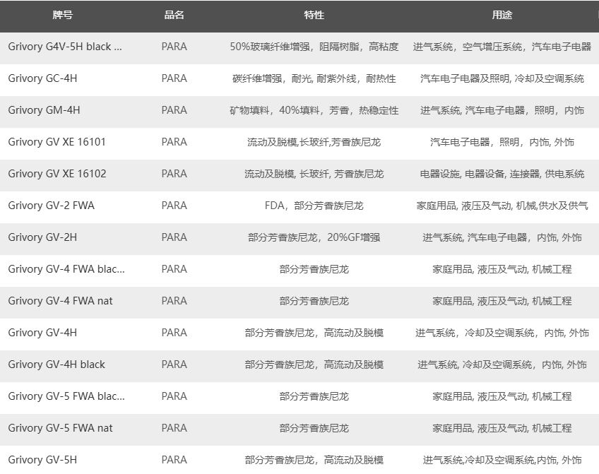 瑞士-EMS Grivory PARA聚酰胺产品供应的各个型号及应用如下