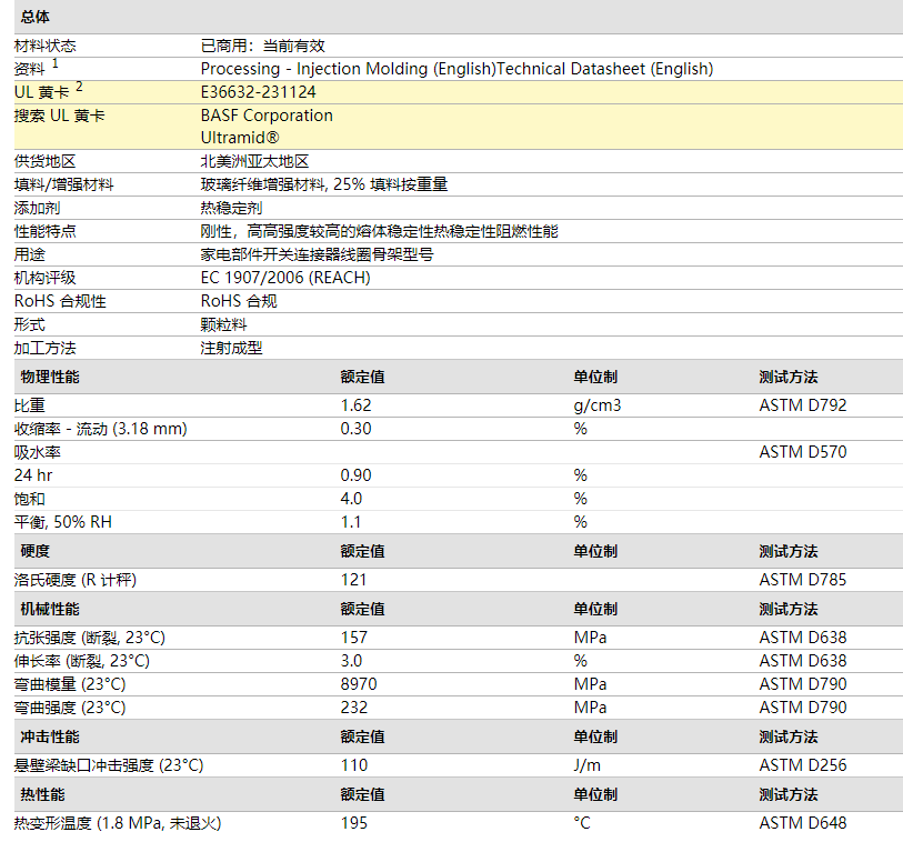 巴斯夫PA66 Ultramid 8232G HS FR牌号简介:玻纤增强,热稳定性,阻燃性,高强度,注塑级,可快速加工。用途包括高应力部件,如轴承,轴承保持架,齿轮,线圈架和电缆连接器。