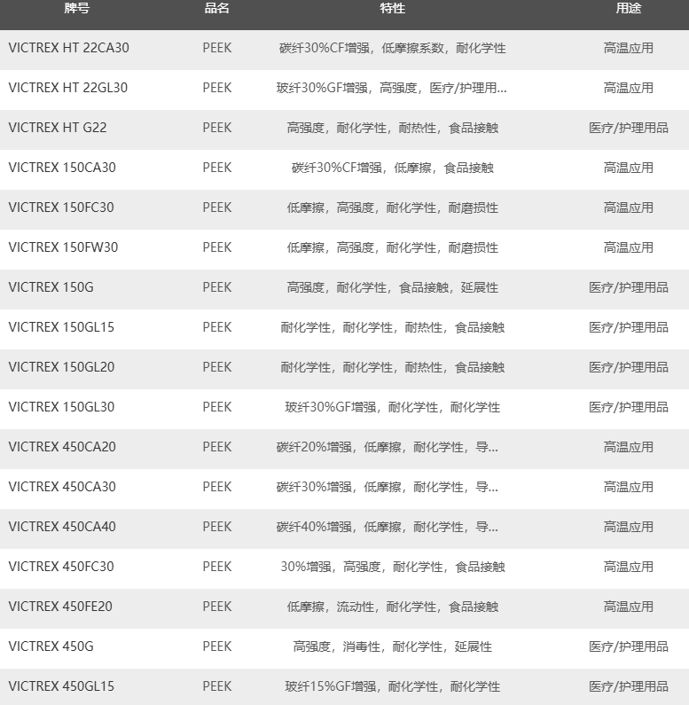 英国-威格斯VICTREX PEEK聚合物市场供应品牌及应用如下: