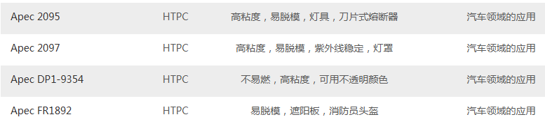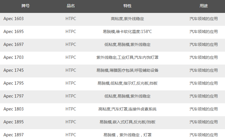 科思创APEC®耐高温聚碳酸酯(PC-HT)的市场销售产品牌号如下: