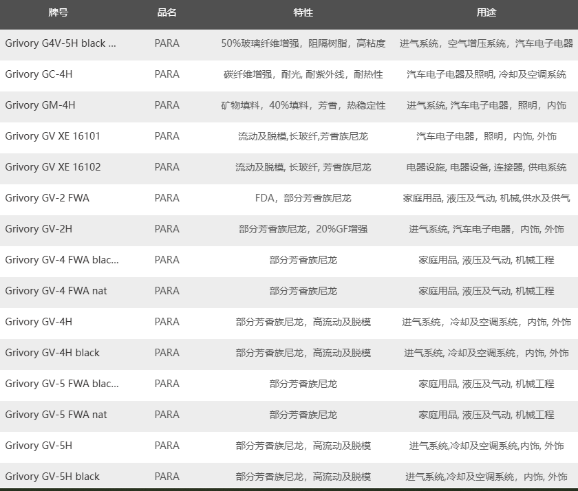 瑞士-EMS Grivory PARA半芳族尼龙树脂主要产品牌号与典型应用: