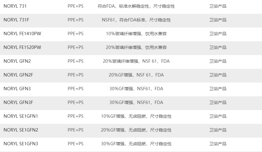 其中,NORYL树脂是PPE和HIPS的完全相同共混物。它具有PPE的高温刚性、电气性能、非溴非氯阻燃性,以及HIPS的流动性、抗冲击性和加工性能。可广泛应用于汽车、医疗、电气、储能、光伏、水处理等领域。