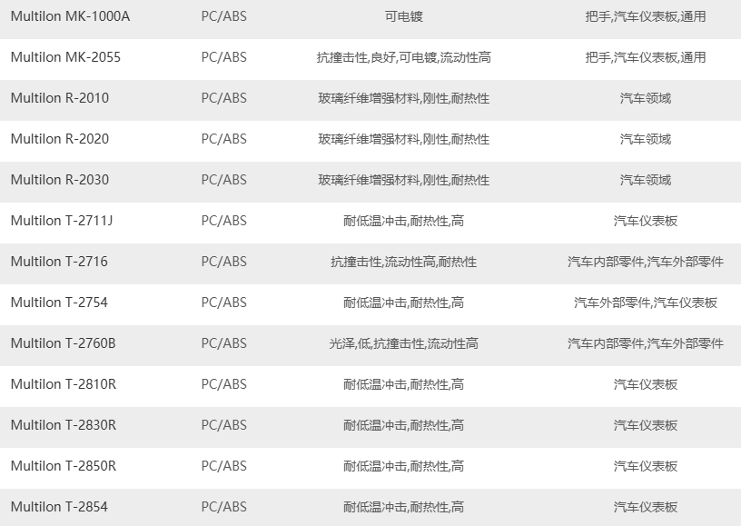 帝人Multilon PC/ABS塑料在汽车中的应用的产品牌号: