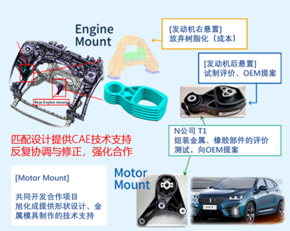 旭化成用用PA66树脂代替铸铝制支架。旭化成采用聚酰胺(PA66)的LEONA™(雷欧娜™) GF增强级“14G50”开发设计了用于发动机的支架和用于电机的支架。它具有优异的耐热性、高强度、高刚性和抗疲劳性。根据刚性和强度要求进行了设计,通过成型仿真技术,准确掌握了玻纤排向和熔接线的位置,并实施了反映该信息的应力分析,对其力学性能进行了评估。