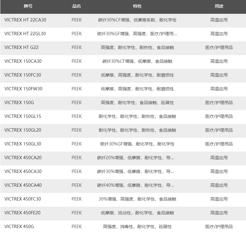 VICTREX PEEK聚合物引领未来的性能发展趋势。这些牌号可以以粒料和粉料的形式提供,并且已在各种具有挑战性的应用中表现出可靠性。VICTREX HT™和VICTREX ST™聚合物具有稳定表现:(1)可在更高温度环境中突破性能极限采用更轻的解决方案,可降低燃油消耗并减少对环境的影响 (2):在很宽的温度范围内保持优异的弹性性能,从而延长零件使用寿命 (3):优异的耐磨性,增加部件的耐用性 (4):耐腐蚀性化学品和天然元素,从而减少停机时间和部件失效 (5):值得信赖的长期力学性能和尺寸稳定性 (6):符合严格的安全要求,具有阻燃、低烟和低毒排放等特点 (7):对各种液体和油脂具有优异的阻隔性,从而保证更高的零件综合性能。