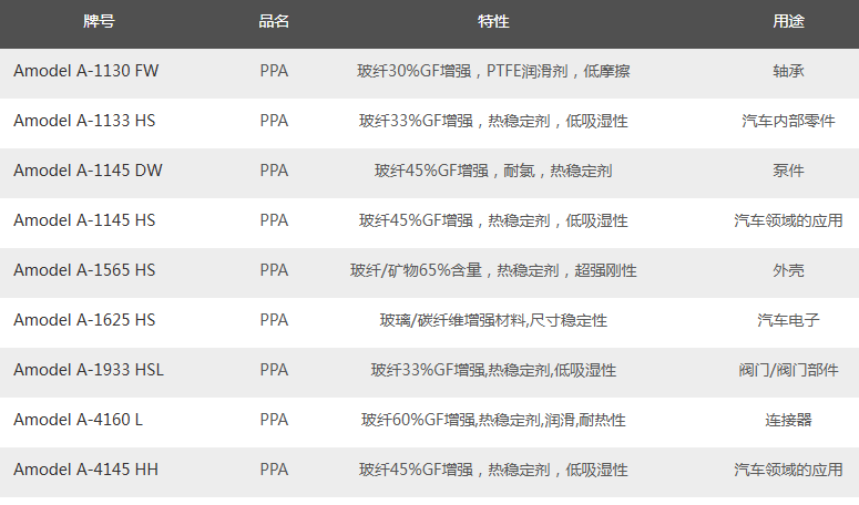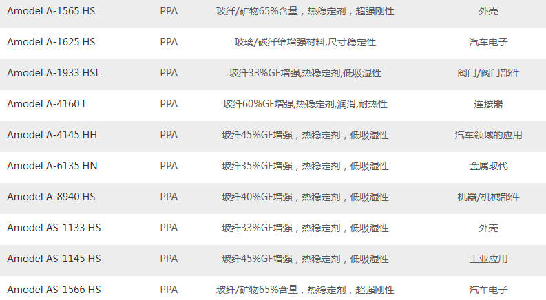 市场销售索尔维Amodel PPA牌号及性能应用如下: