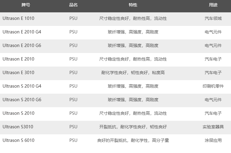巴斯夫聚砜树脂商品名为Ultrason®,产品系列包括聚醚砜(PESU)、聚砜(PSU)和聚苯砜(PPSU)。